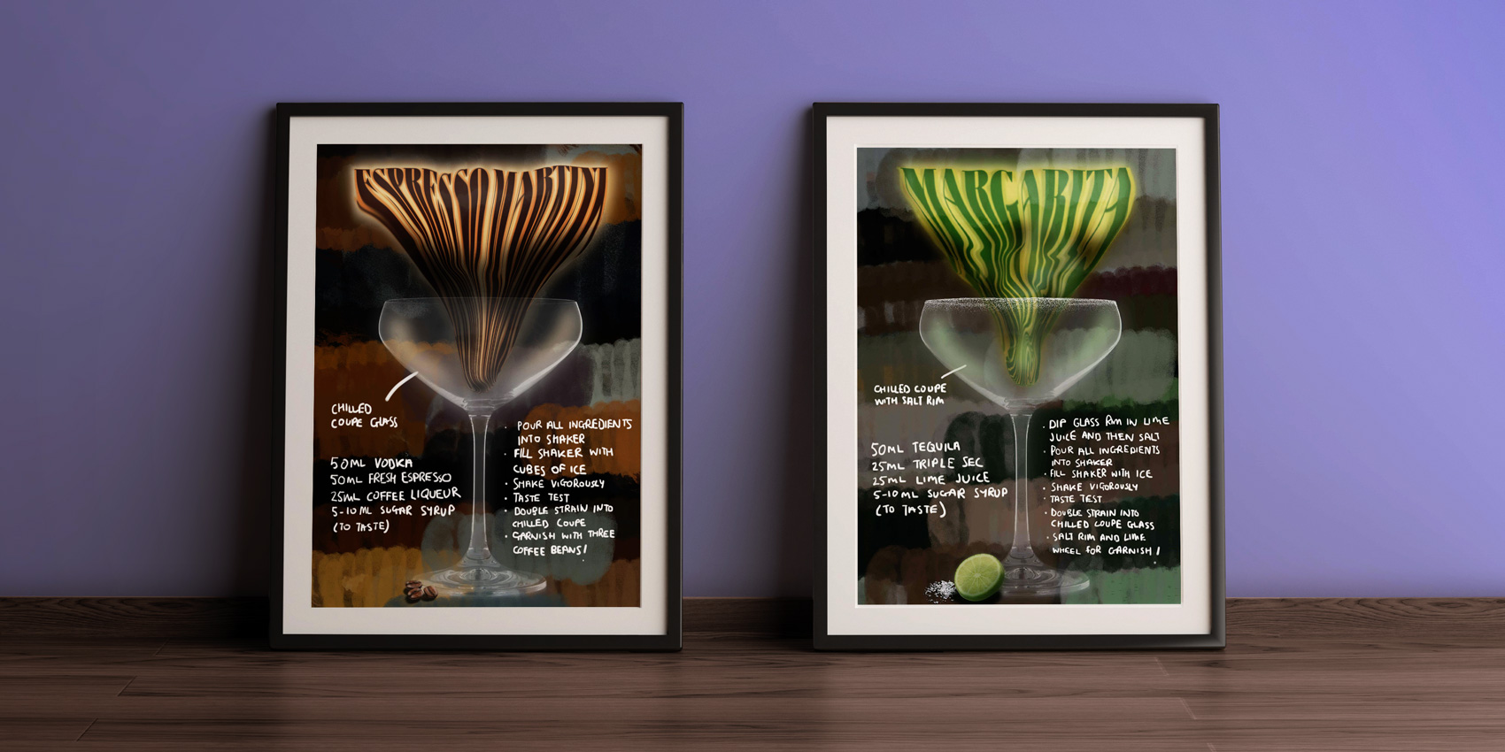 During the COVID-19 Lockdown in London, these posters came as a result of completing an online Photoshop course. This poster series is an attempt to solidify these news skills and an understanding of specific tools whilst carrying out a personal project. The series is made for people who need instructions on how to make certain cocktails to a professional standard and could also serve as wall decoration for a cocktail bar.